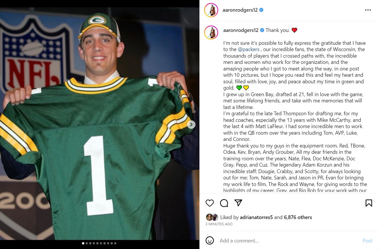 Source : www.packers.comAaron Rodgers says his goodbye to Green Bay, via Instagram